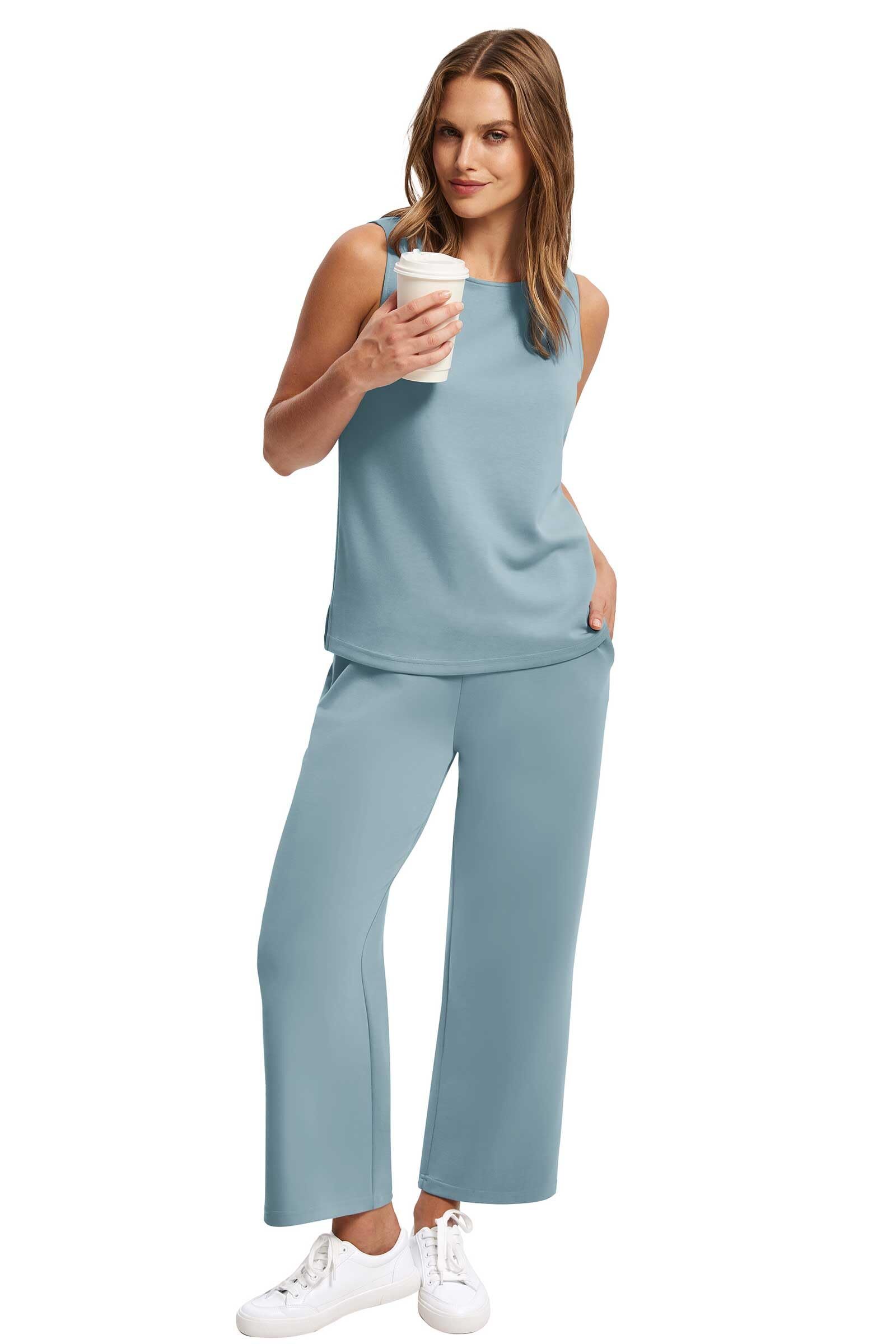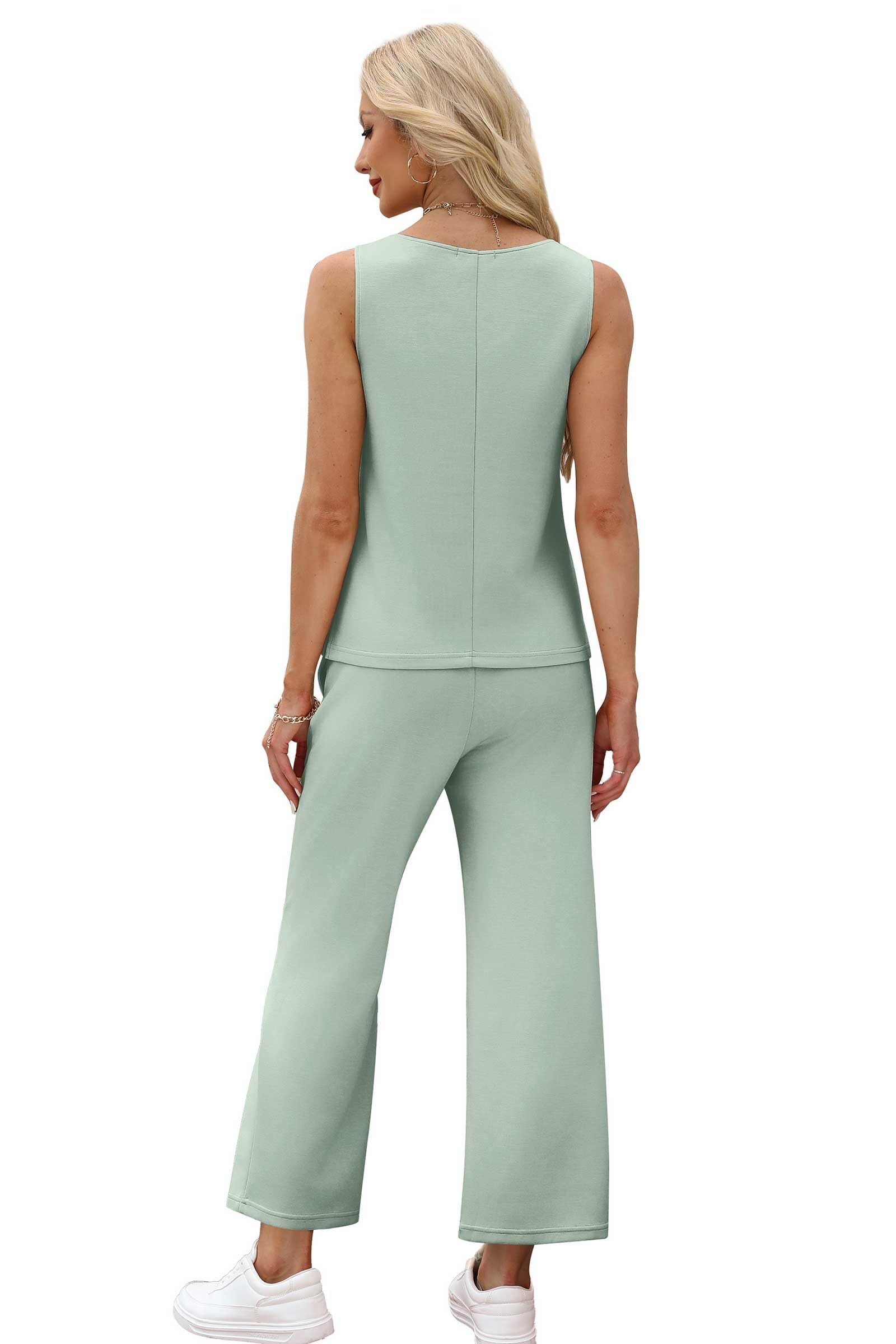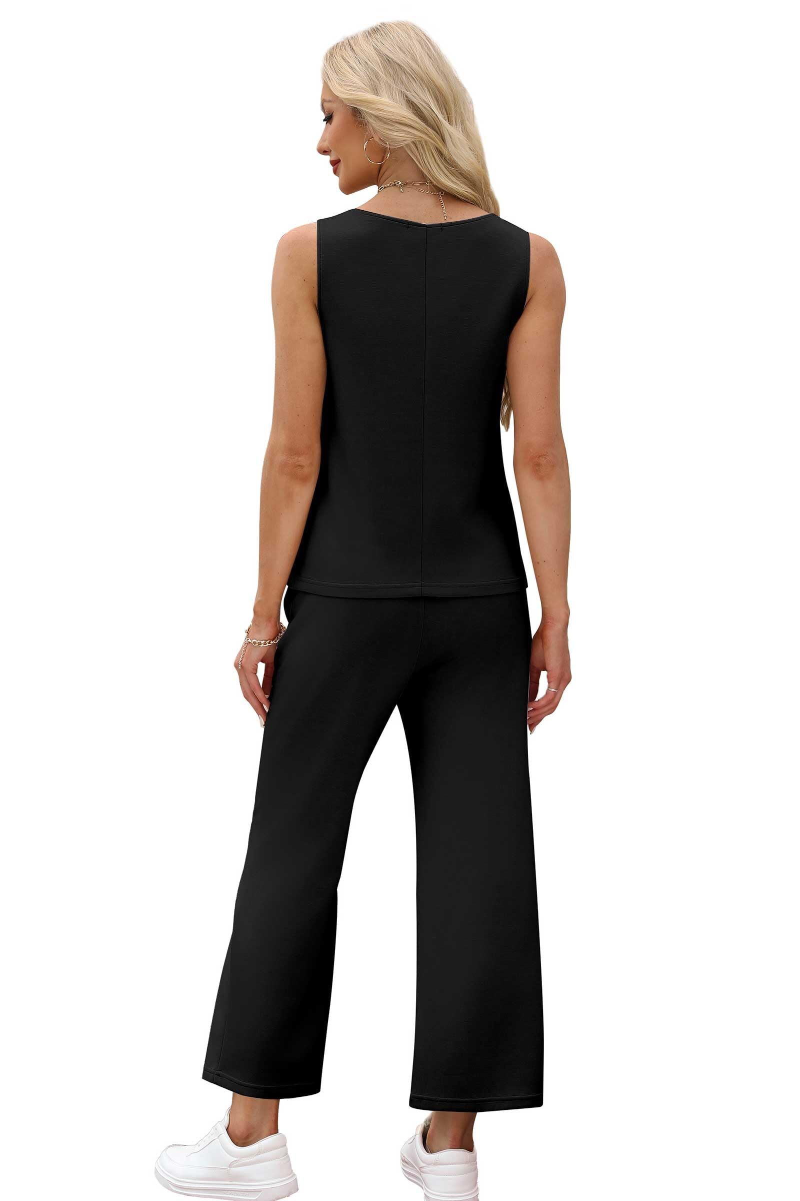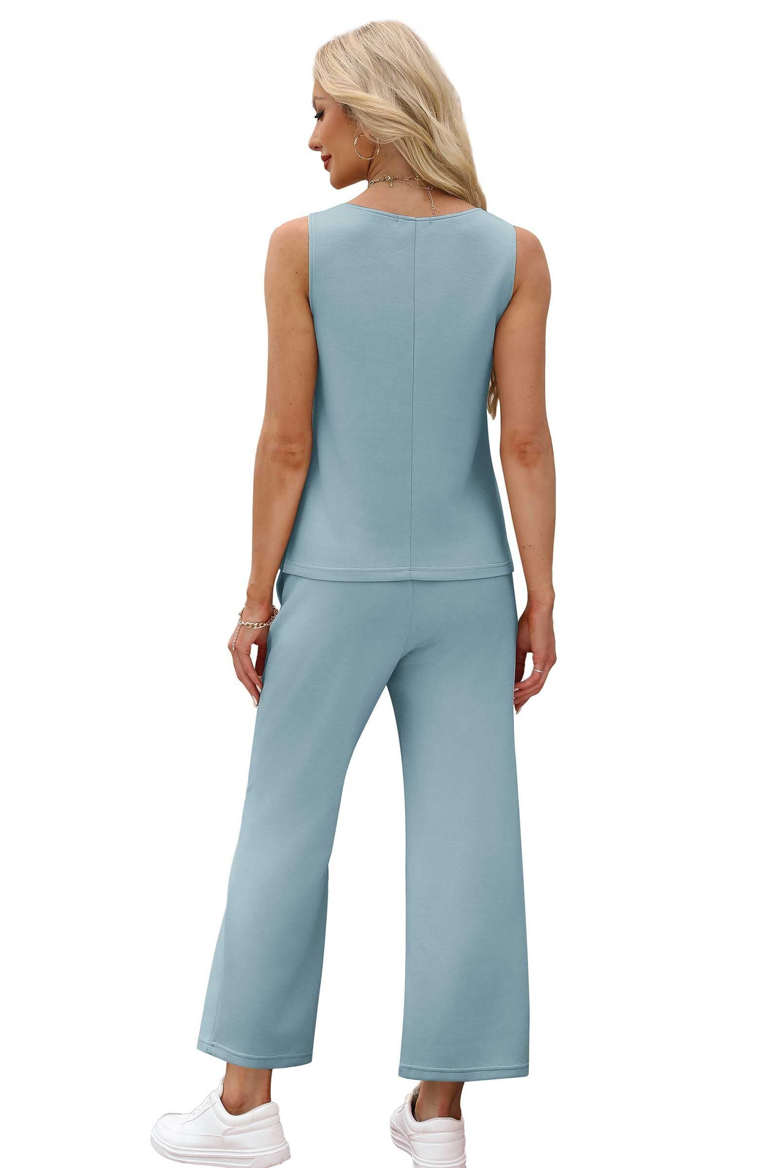 - Design:Crew neck sleeveless tops,top paired with wide leg crop pants,Cropped lengthn.Contoured Back for The Most Flattering Rear View, while the elastic drawstring ensures a customizable fit.