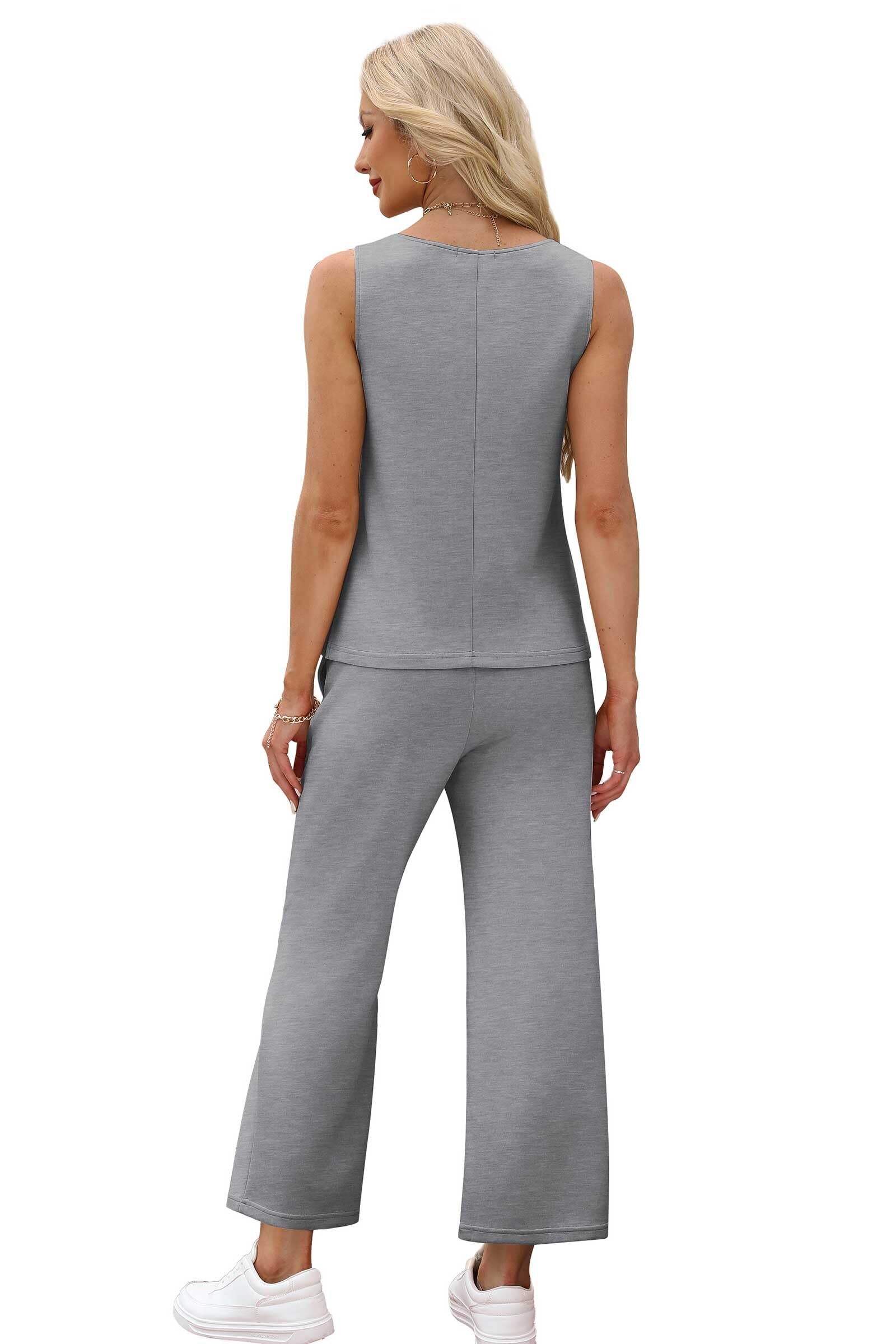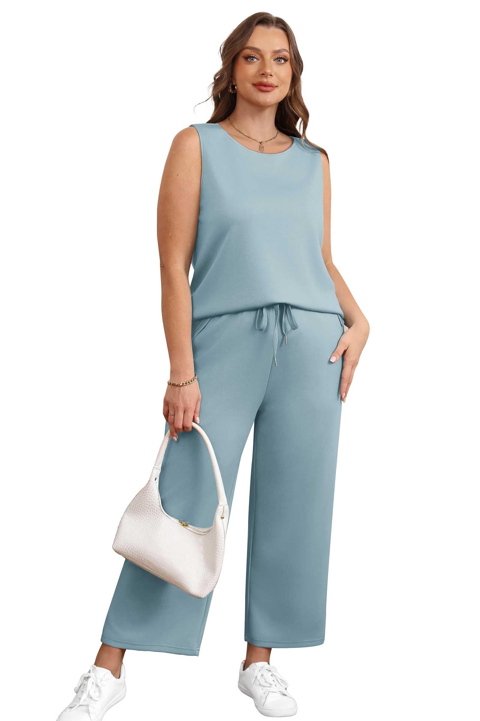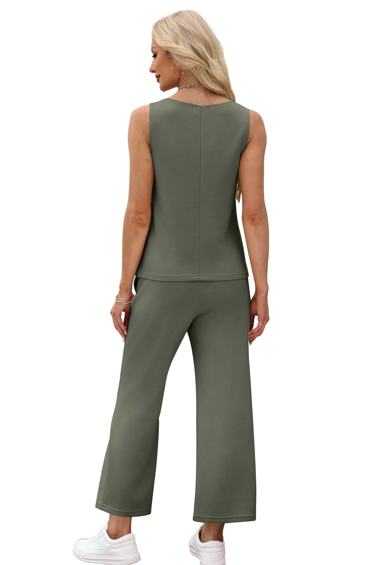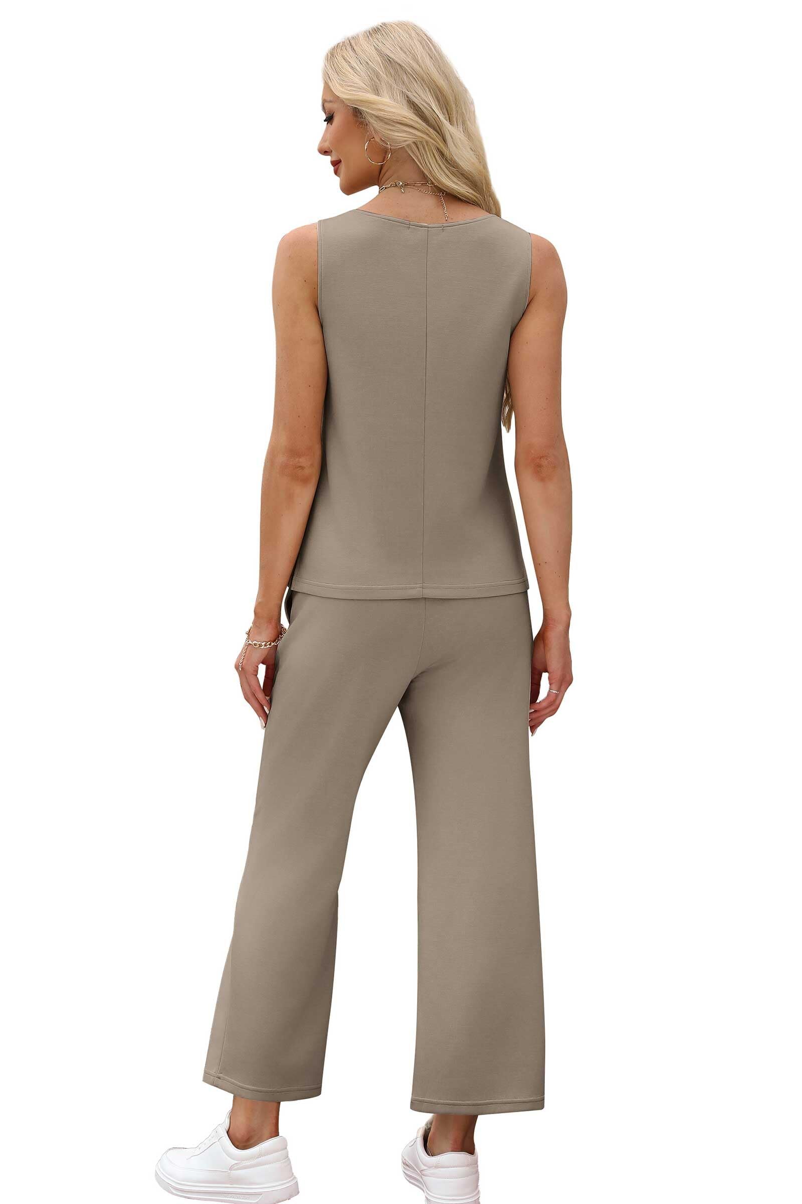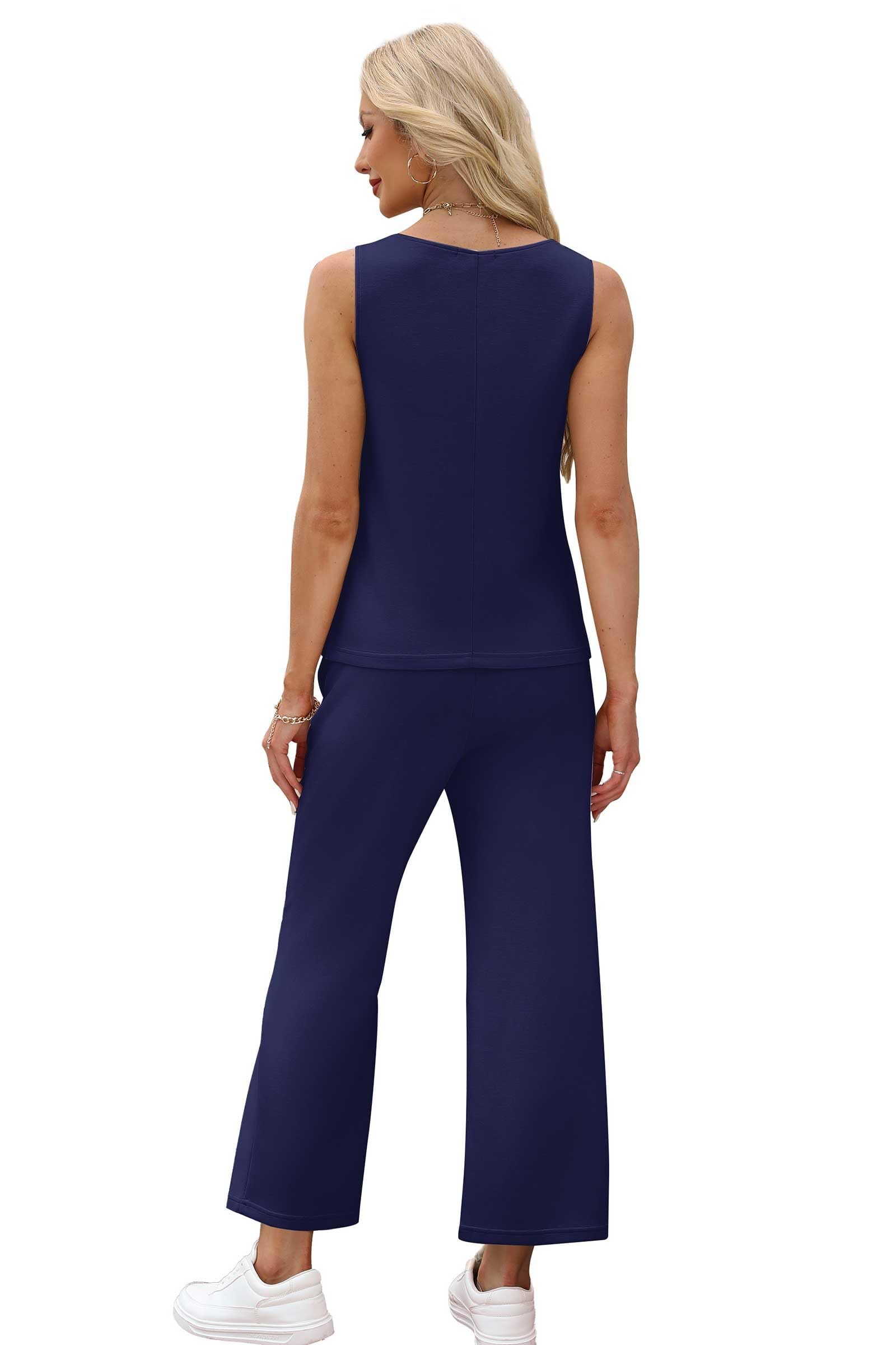 - Design:Crew neck sleeveless tops,top paired with wide leg crop pants,Cropped lengthn.Contoured Back for The Most Flattering Rear View, while the elastic drawstring ensures a customizable fit.