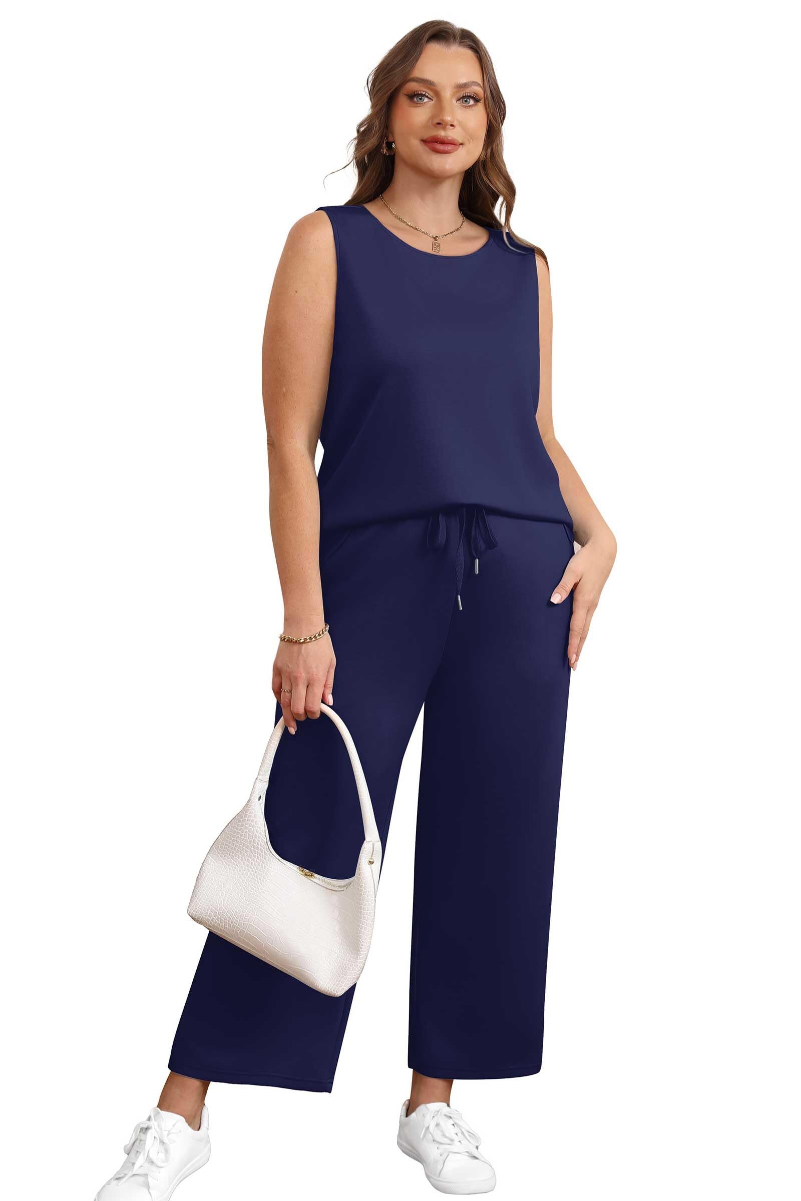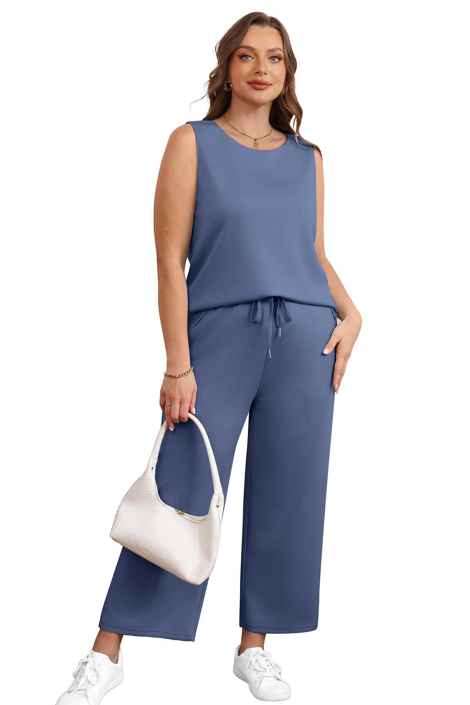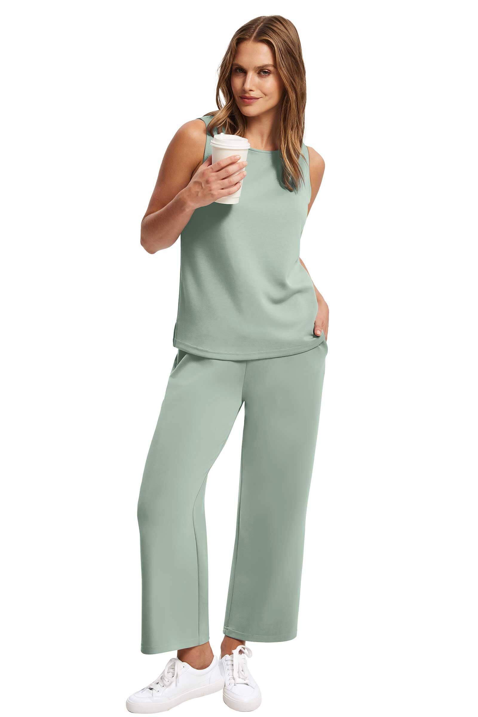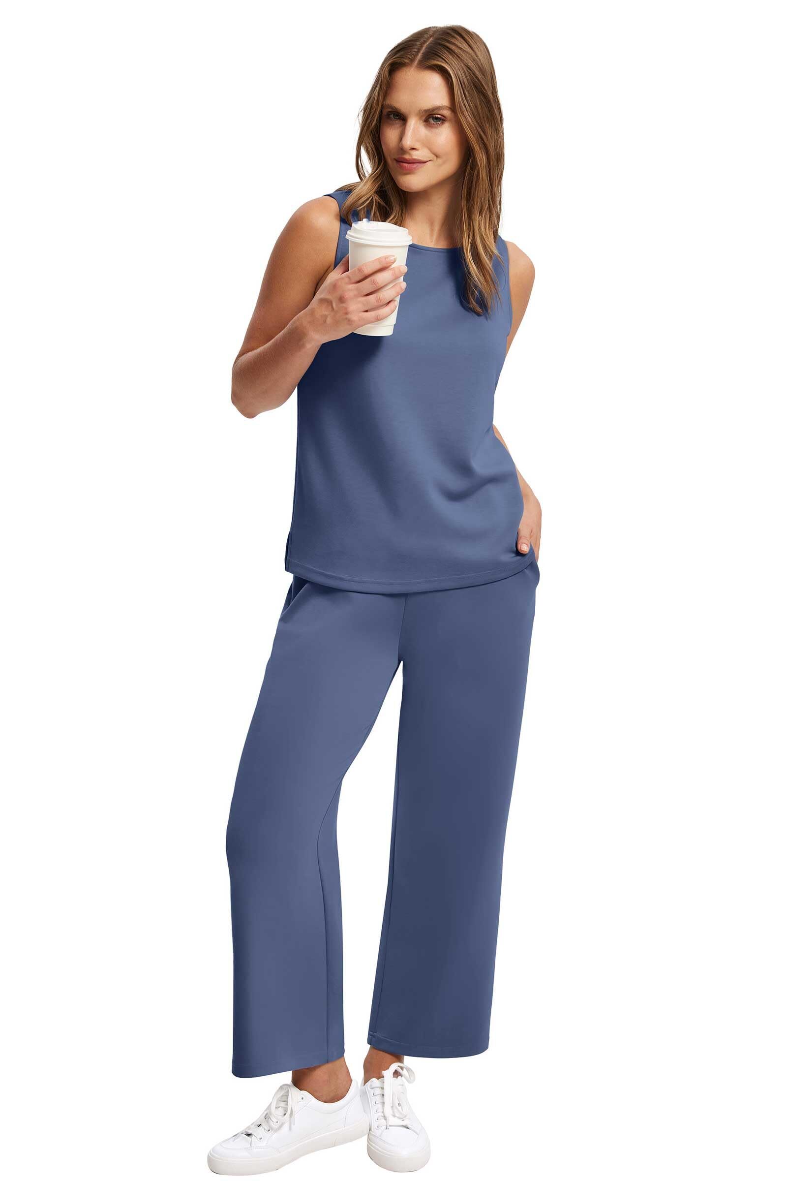 - Design:Crew neck sleeveless tops,top paired with wide leg crop pants,Cropped lengthn.Contoured Back for The Most Flattering Rear View, while the elastic drawstring ensures a customizable fit.