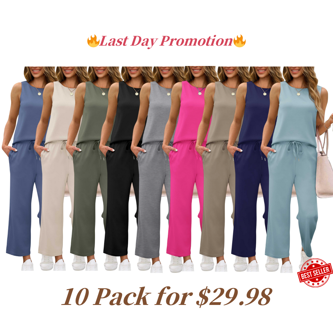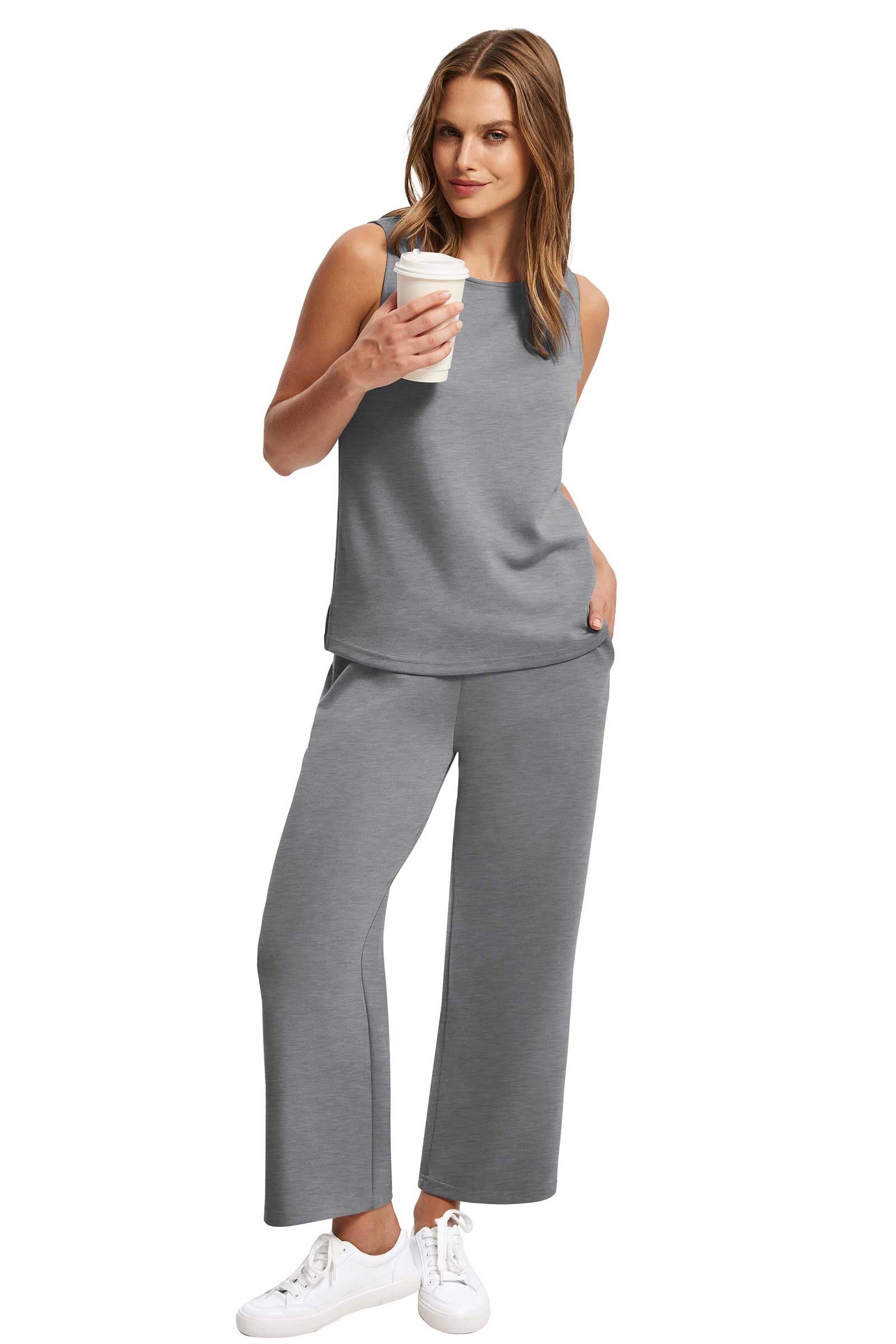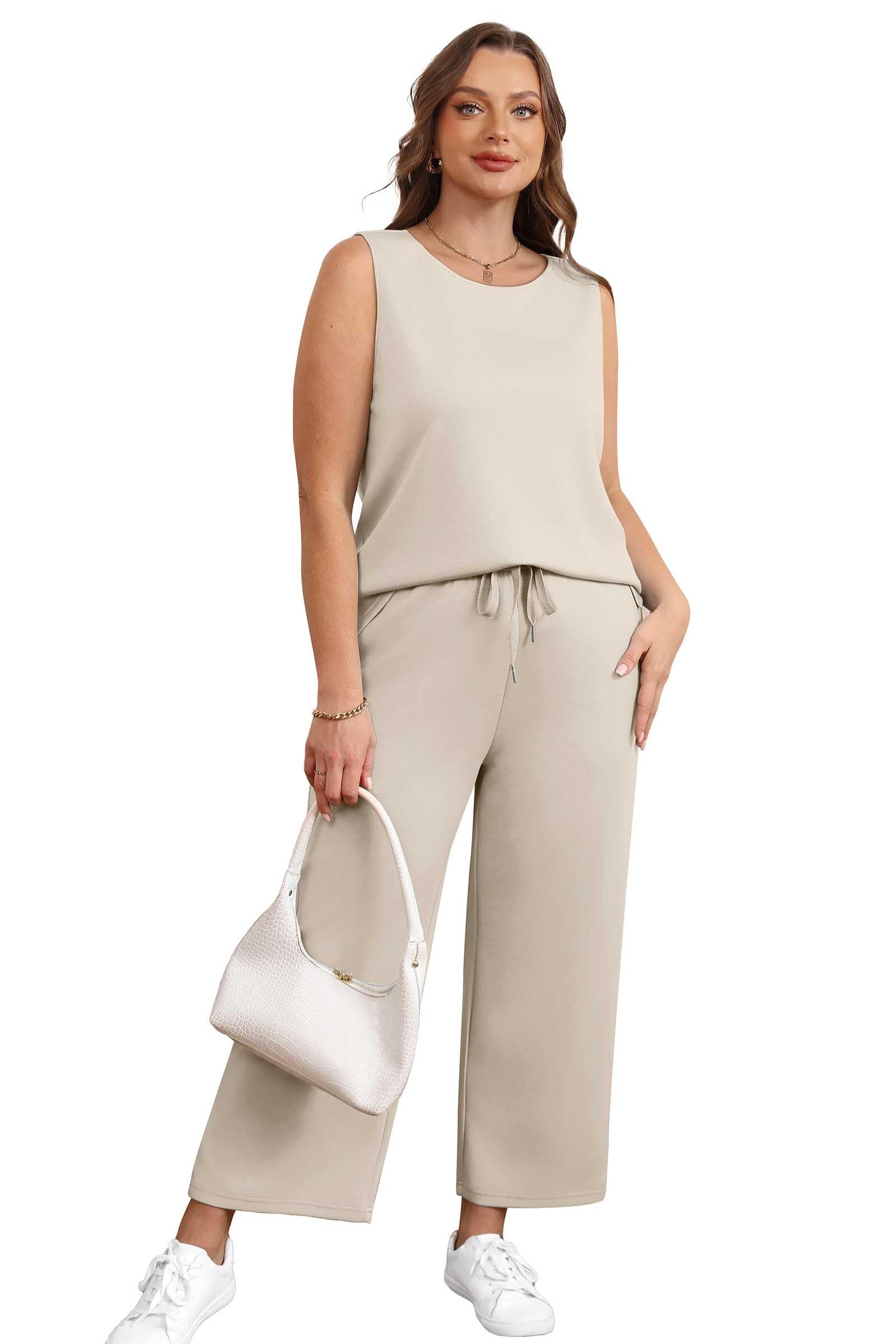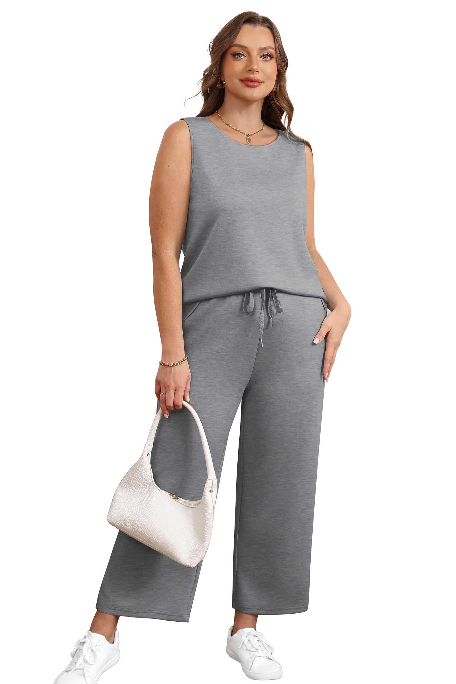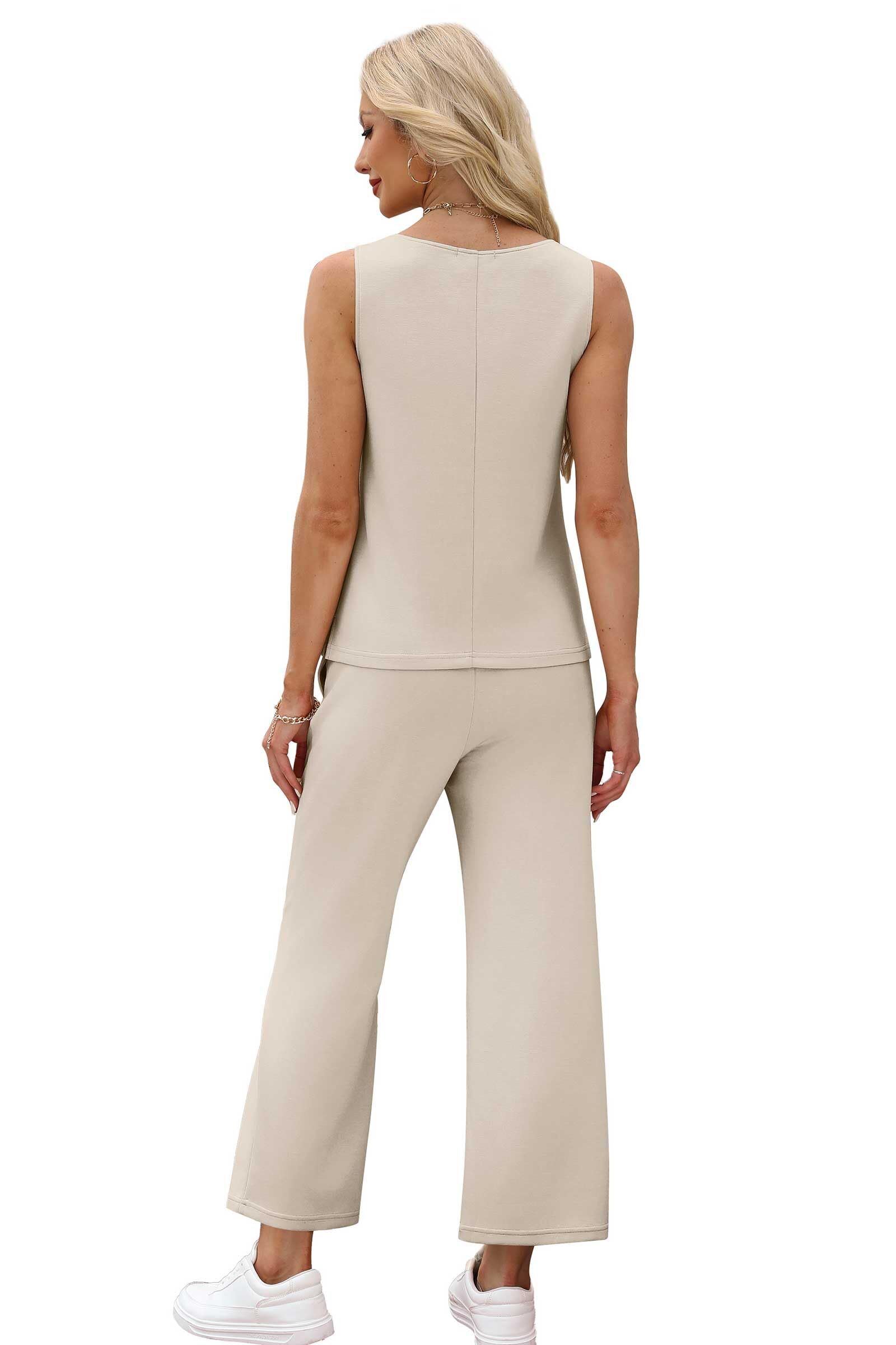 - Design:Crew neck sleeveless tops,top paired with wide leg crop pants,Cropped lengthn.Contoured Back for The Most Flattering Rear View, while the elastic drawstring ensures a customizable fit.