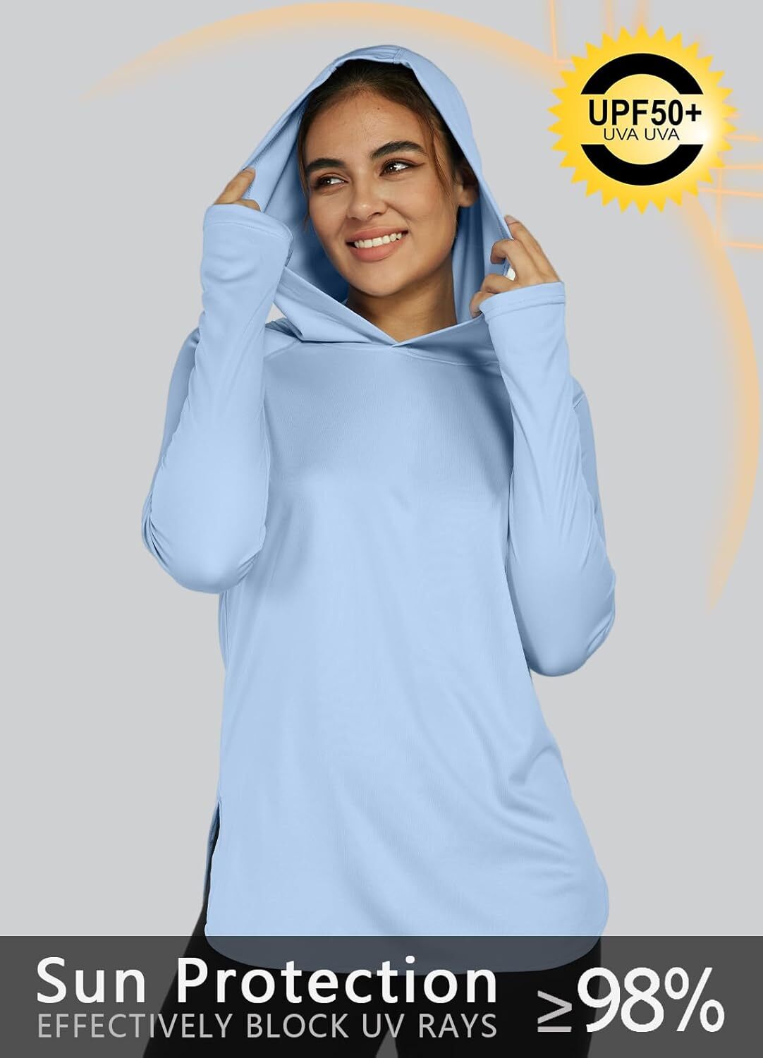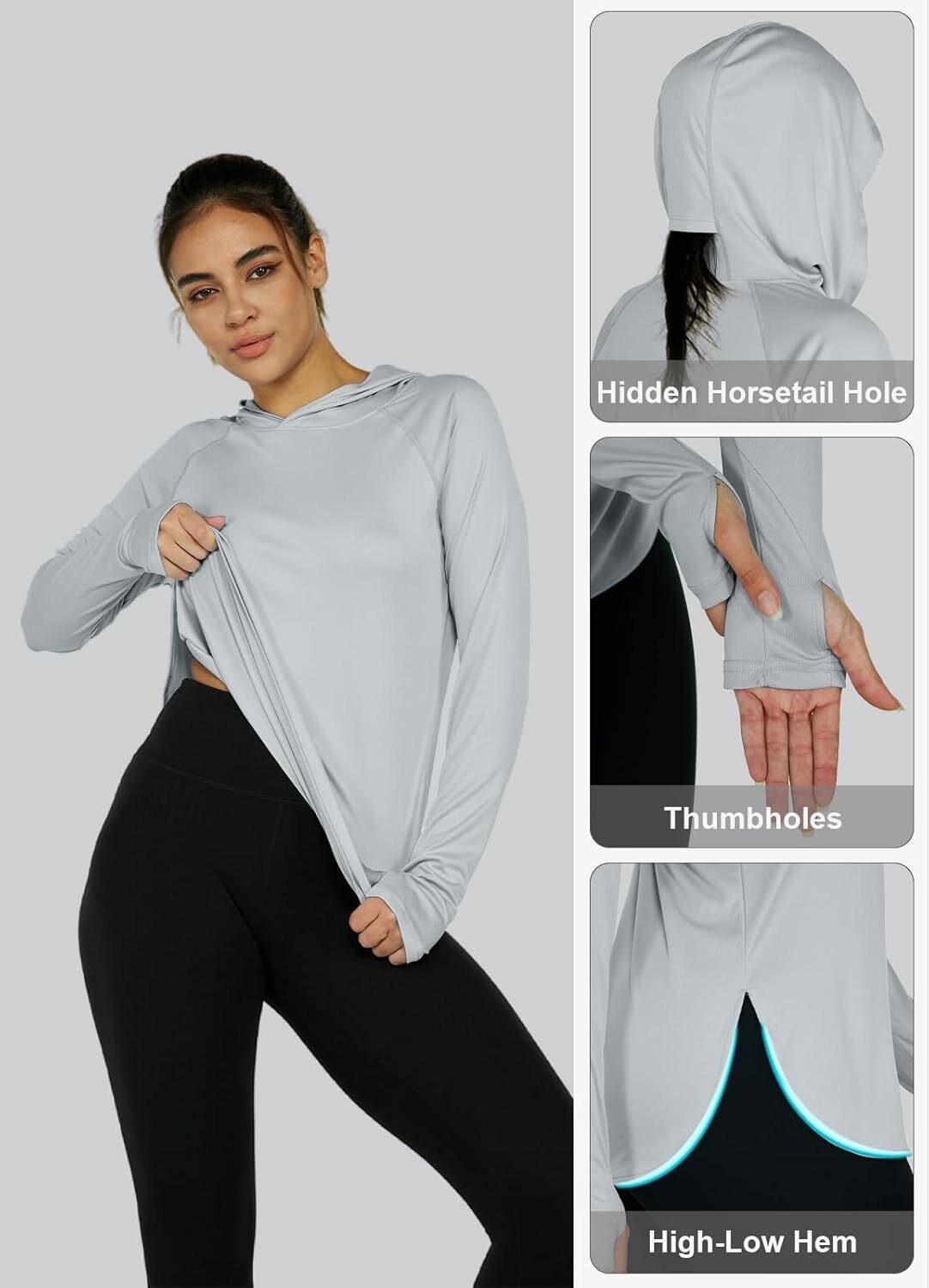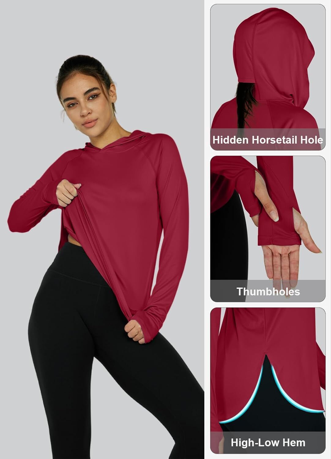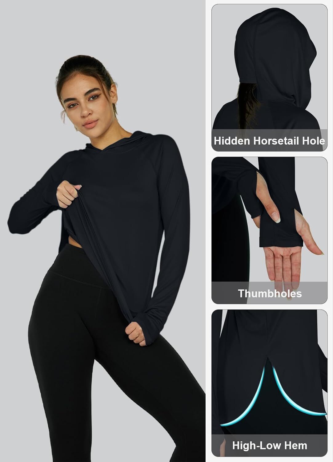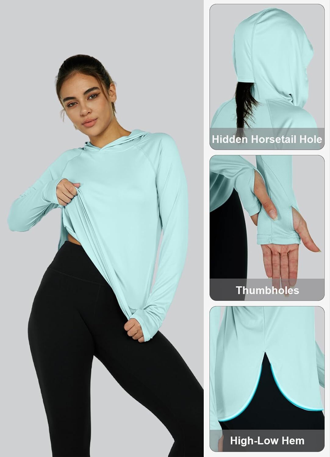 - [Hidden Horsetail Hole] Get extra sun protection with our sun shirts that come with a hood and thumb holes. Perfect for those who can't stand the heat or are too lazy for sunscreen.